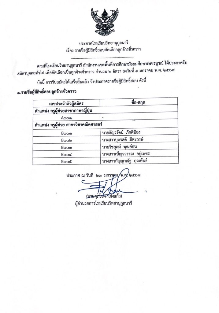 ประกาศโรงเรียนวิทยานุกูลนารี เรื่อง รายชื่อผู้มีสิทธิ์สอบคัดเลือกลูกจ้างชั่วคราว