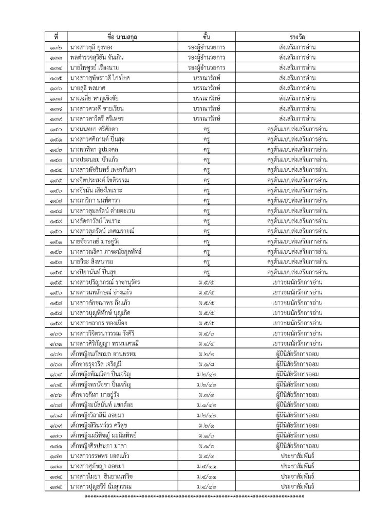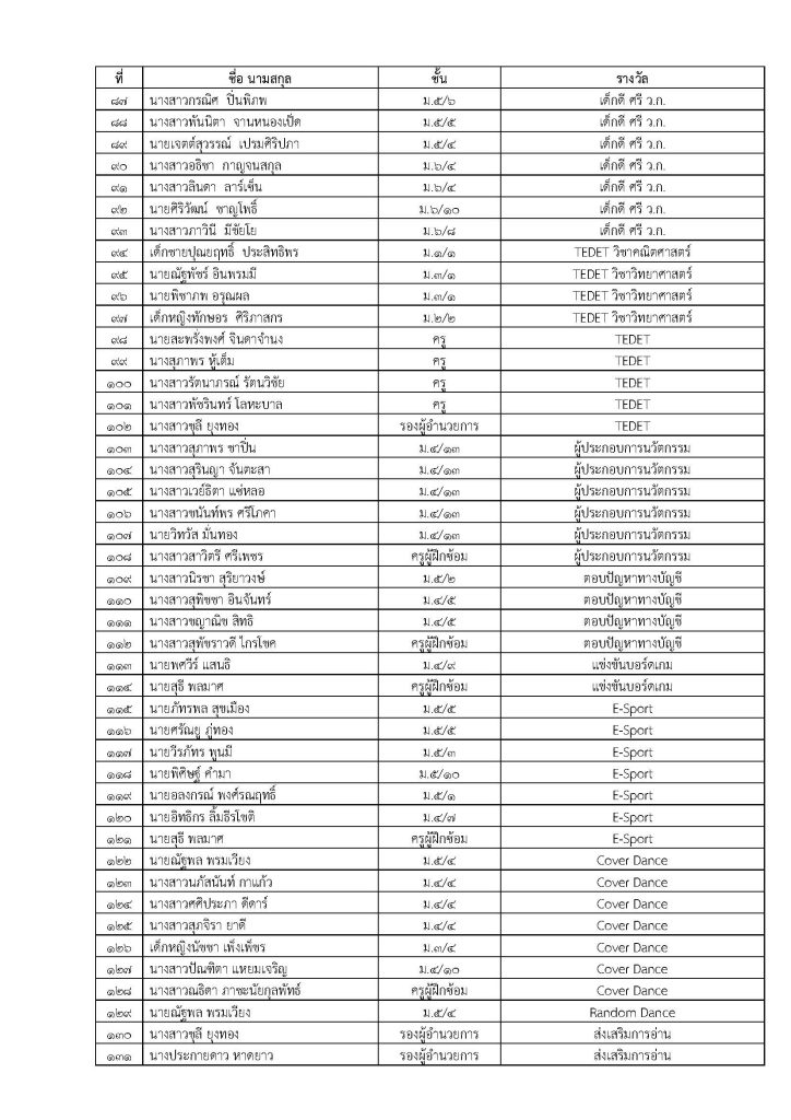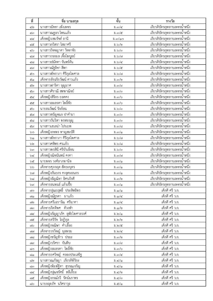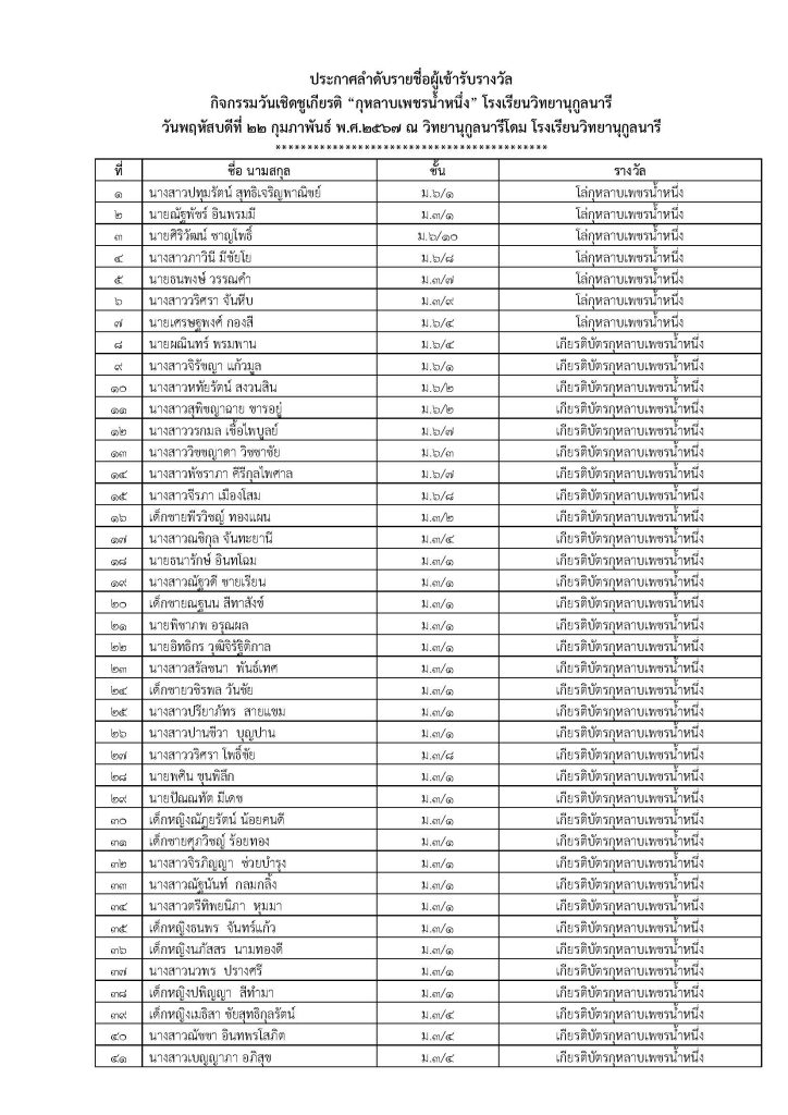 ประกาศลำดับรายชื่อผู้เข้ารับรางวัลกิจกรรมวันเชิดชูเกียรติ “กุหลาบเพชรน้ำหนึ่ง” โรงเรียนวิทยานุกูลนารีวันพฤหัสบดีที่ ๒๒ กุมภาพันธ์ พ.ศ.๒๕๖๗ ณ วิทยานุกูลนารีโดม โรงเรียนวิทยานุกูลนารี