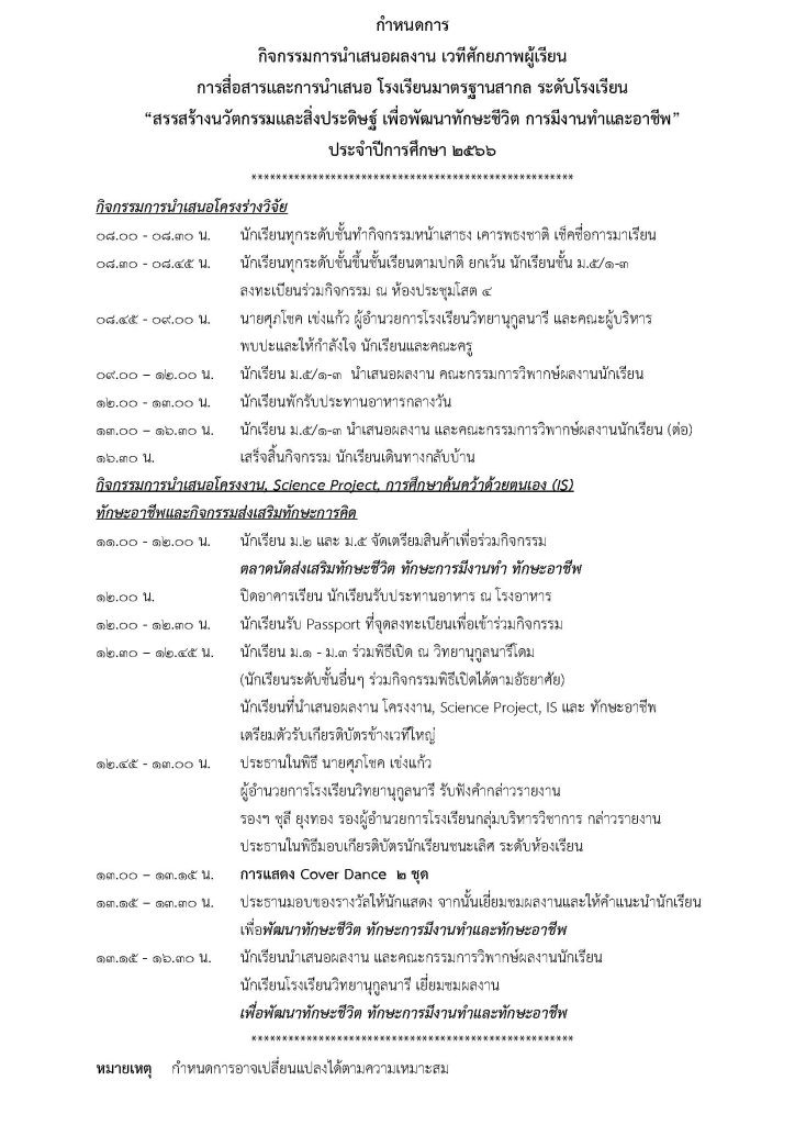 การสื่อสารและการนำเสนอ โรงเรียนมาตรฐานสากล ระดับโรงเรียน “สรรสร้างนวัตกรรมและสิ่งประดิษฐ์ เพื่อพัฒนาทักษะชีวิต การมีงานทำและอาชีพ” ประจำปีการศึกษา ๒๕๖๖ วันพุธที่ ๒๘ กุมภาพันธ์ พ.ศ. ๒๕๖๗